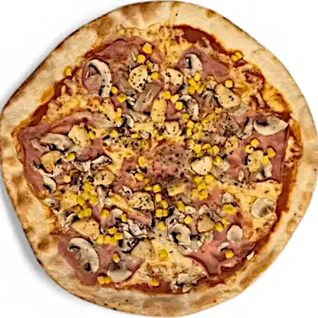 Chrumkavá Pizza Pollo s rajčinovým základom, syrom, šunkou, kuracím mäsom, kukuricou, šampiňónmi, oregánom, cesnakovými okrajmi