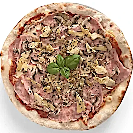 Chrumkavá Pizza Quattro Stagioni s rajčinovým základom, syrom, šunkou, šampiňónmi, artičokami, oregánom, cesnakovými okrajmi